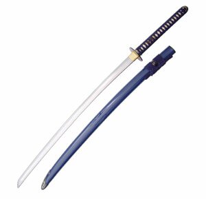 Ręcznie kuta katana. Pochwa lakierowana, niebieska z wstawkami z byczego rogu. Rękojeść drewniana, pokryta wysokiej jakości skórą, okręcona sznurem z wysokiej jakości japońskiej bawełny.